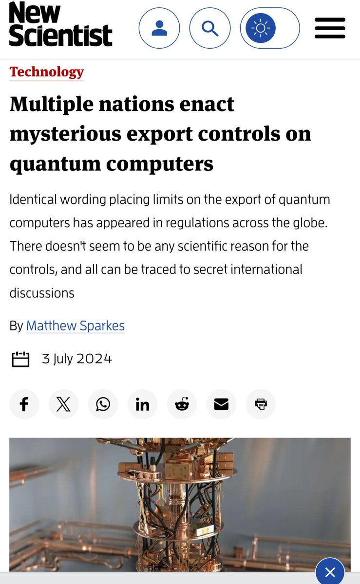 🔅 لقد أدت المناقشات الدولية السرية إلى قيام الحكومات في جميع أنحاء العالم بفرض ضوابط تصدير متسابهه على أجهزة الكمبيوتر الكمومية واجزاءها. في حين رفضت تلك الدول الكشف عن الأساس المنطقي العلمي وراء هذه اللوائح.
