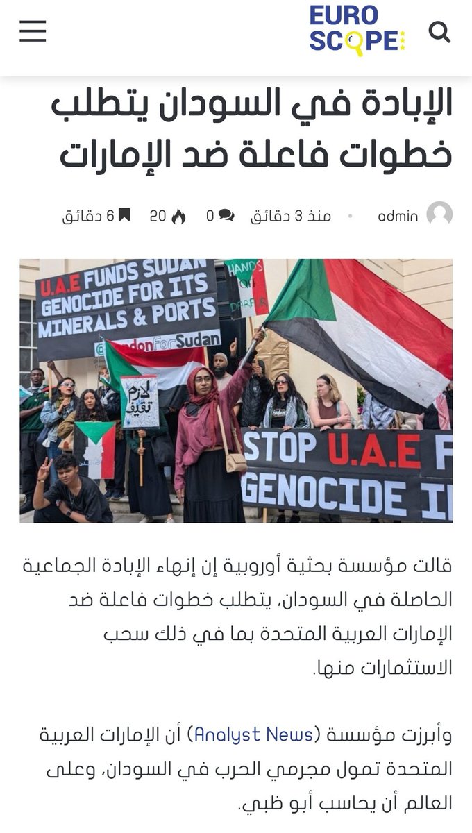 وأبرزت مؤسسة (Analyst News) أن الإمارات العربية المتحدة تمول مجرمي الحرب في السودان، وعلى العالم أن يحاسب أبو ظبي.
