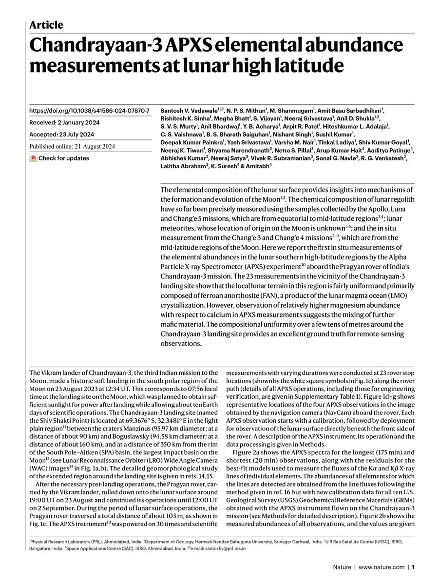 🚨 First results of #Chandrayaan3 are out! The radiation data collected by the APXS reveals that the elemental composition of the Lunar subpolar region includes ferroan anorthosite. This provides direct evidence that a magma ocean formed on the Moon after its creation...1/3