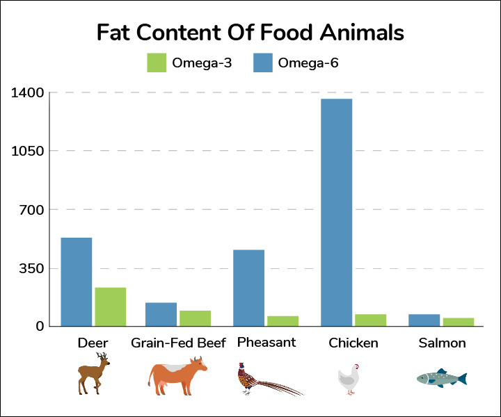 فالطيور التي تتغذى على الحبوب التقليدية تحتوي على نسبة أوميغا 6 إلى أوميغا 3 قد تصل إلى 17:1.