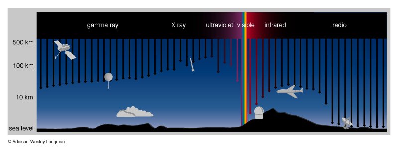 كل الأشعة تجد طريقها الى الأرض لكن الغلاف الجوي يتعامل ويتفاعل معها بحيث يرد بعضها ويسمح بأخرى بنسب مختلفة ومما يسمح به الضوء .