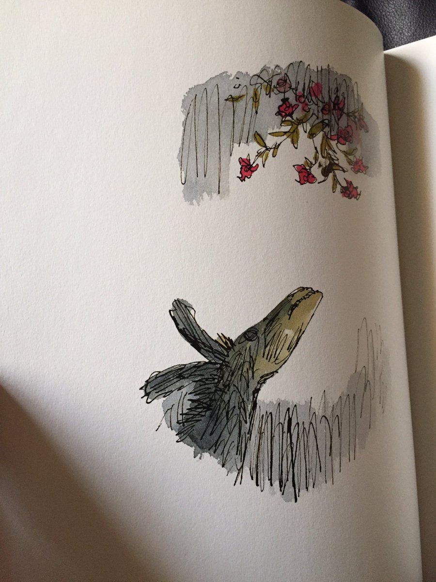 ثانيها لأنّها مزيّنة بريشة كوينتن بليك، وهو -لمن لا يعرفه- أشهر مصوّر كتب أطفال على قيد الحياة، عُرف بأعماله المشتركة مع الروائي روالد دال =