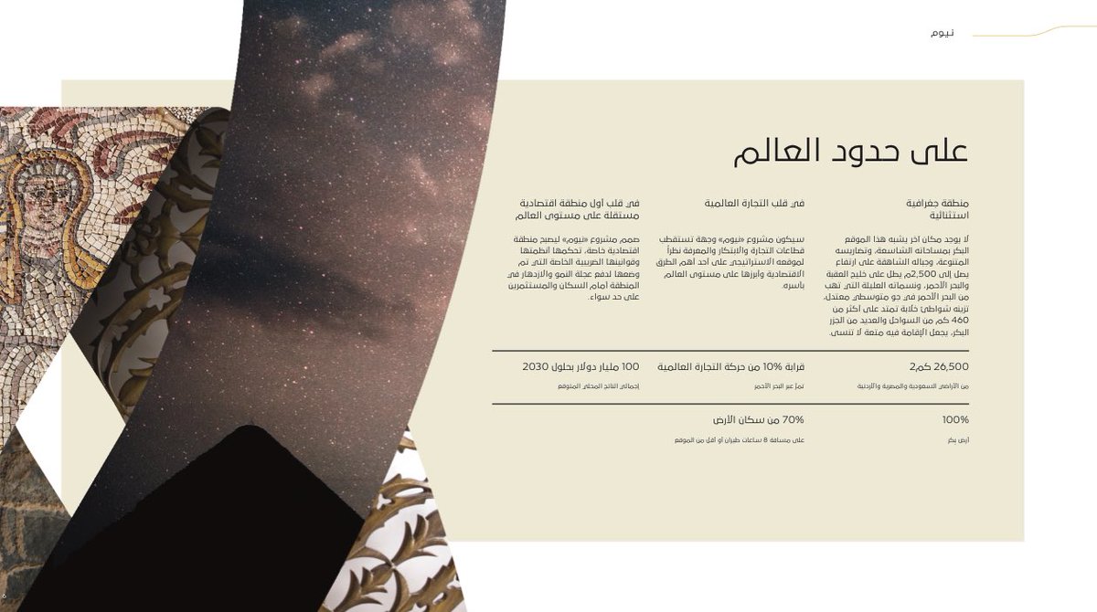 موقع #نيوم يعد محوراً يربط القارات الثلاث آسيا وأوربا وأفريقيا إذ يمكن لـ ٧٠٪ من سكان العالم الوصول له خلال ٨ ساعات