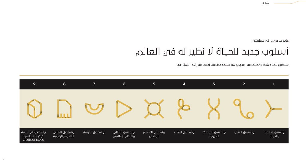 وصرح سمو ولي العهد خلال إعلانه عن المشروع أن : #منطقة_نيوم ستركز على تسعة قطاعات استثمارية متخصصة تستهدف مستقبل الحضارة الإنسانية.