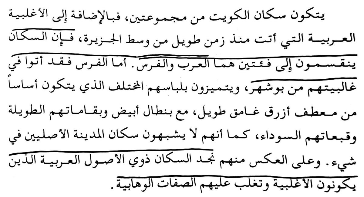 يلاحَظ هنا وصفُه لطبيعة السكان العرب في الكويت (تغلب عليهم الصفات الوهابية!) وهي كلمة يطلقها للتعبير عن التمسك الديني السلفي