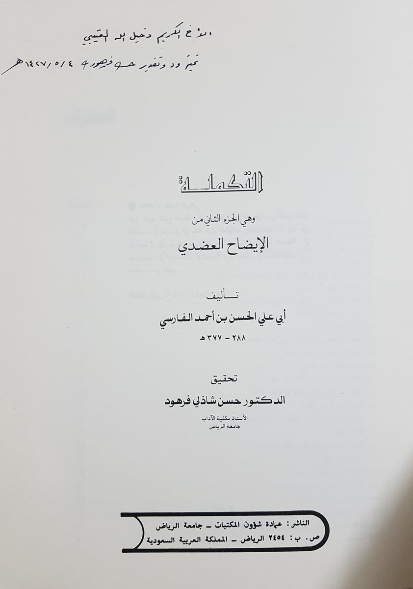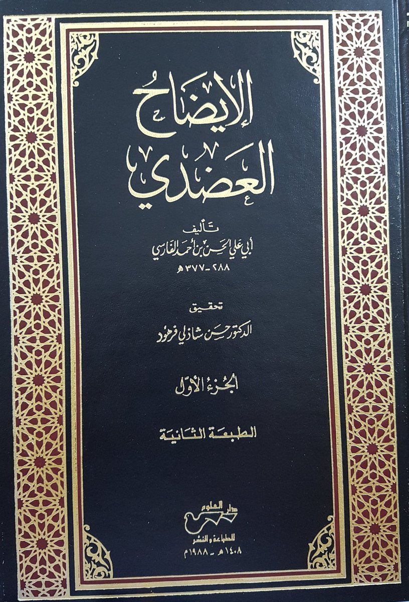 (الإيضاح العَضدي) و(التكملة)، كلاهما لأبي علي الفارسي، من أهم متون النحو والصرف، بقي زمانا وهو كتاب درس في المعاهد؛ حتى كثرت عليه الشروح والحواشي..، له طبعات جيدة، لاسيما التكملة. ولأنها طُبعت في جهة خاصة غدت إحدى #طبعات_مغفول_عنها