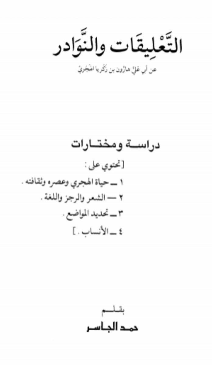 (التعليقات والنوادر) للهجري. أمالٍ في اللغة، حوى فوائد جمّة في اللغة والشعر والأنساب والأخبار.. له طبعة عراقية أحسنت في بقاء الكتاب على حاله، لولا التصحيف الذي يملأ الطبعات العراقية! وطبَعه الجاسر فأضاء بعلمه كل جوانب الكتاب، لولا تصرّفه وتغييره في الترتيب! #طبعات_مغفول_عنها