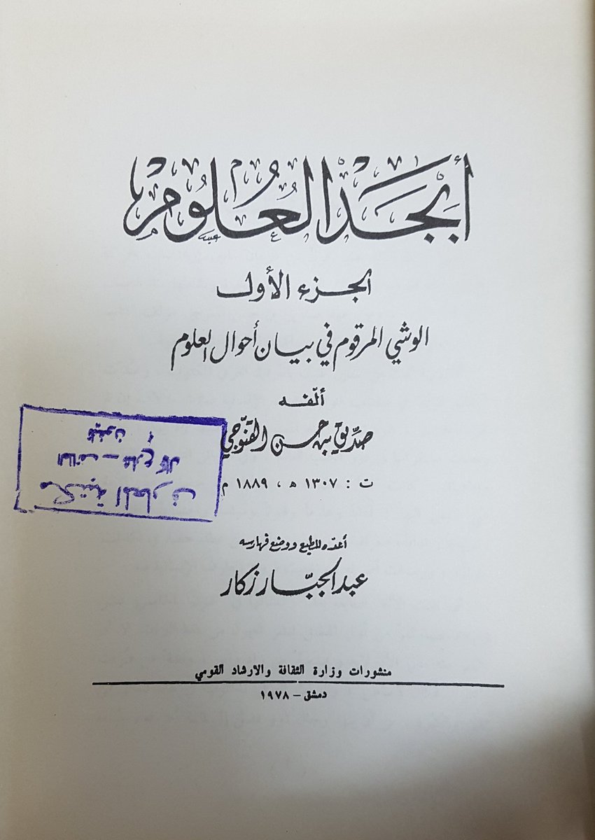 (أبجد العلوم) أو (الوشي المرقوم في بيان أحوال العلوم) للسيد الصدِّيق بن حسن القِنَّوجي، نزيل الهند، هو من أوسع وأنفع الكتب في بيان العلوم والتعريف بأصحابها. وهذه الطبعة أجود طبعاته، ولأنها طُبعت في جهة حكومية، فهي تكاد تكون مُتعذِّرة، إلا من مصوَّرتها هذه. #طبعات_مغفول_عنها