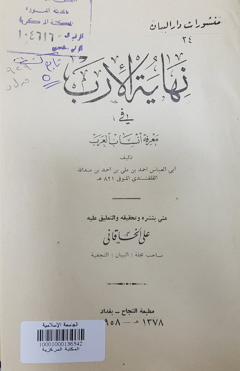 لأبي العباس أحمد بن علي القلقشندي ثم الفزاري، أكثر من كتابة جامعة ومتقنة في الأنساب، لولا التصحيف الذي لا يعرى منه أحد.