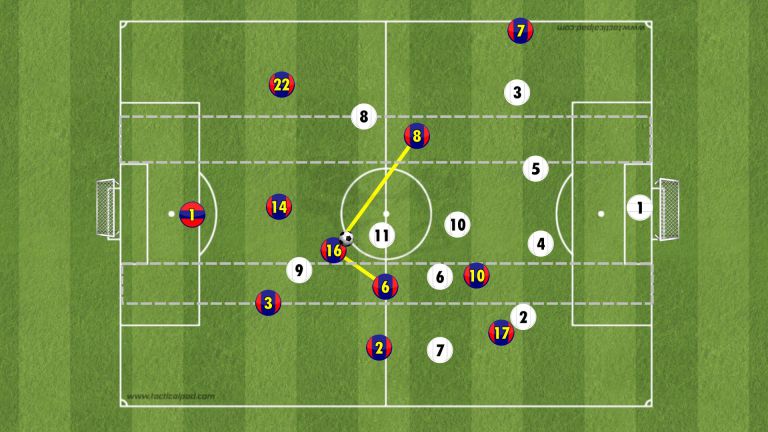 الجدير بالذكر تمركزهم في وسط الميدان, كما نرى في الصورة كان تمركزهم بشكل مائل و ليس بشكل منظم. بوسكيتس في الوسط, تشافي الأقرب اليه و انييستا متقدم اكثر نحو الأمام. هذه نقطة مهمة جدًا لإرباك الخصم و فتح زوايا تمرير عديدة من الصعب اغلاقها خصوصًا امام هؤلاء الثلاث.