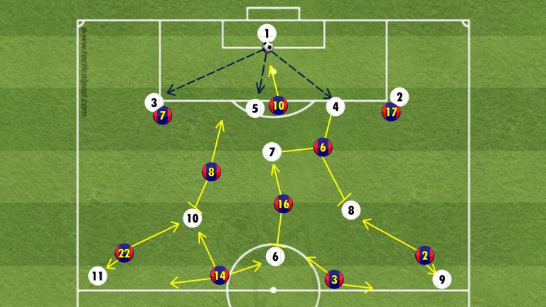 شكل آخر من الضغط عندما تكون الكرة مع حارس الخصم. ميسي يبقى بين قلبي الدفاع, فيا و بيدرو مع الأظهرة, تشافي و انييستا يتقدمان لحماية الوسط من التمريرات الكاسرة للخطوط, بوسكيتس يحمي قلبي دفاع البارسا, ألفيس و ابيدال مع الأجنحة, و بيكي و ماسكيرانو احد منهم يساعد بوسكيتس و الثاني يغطي