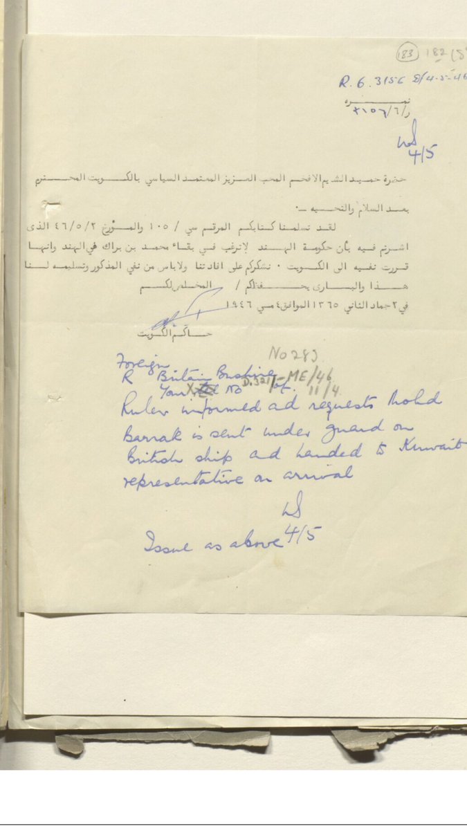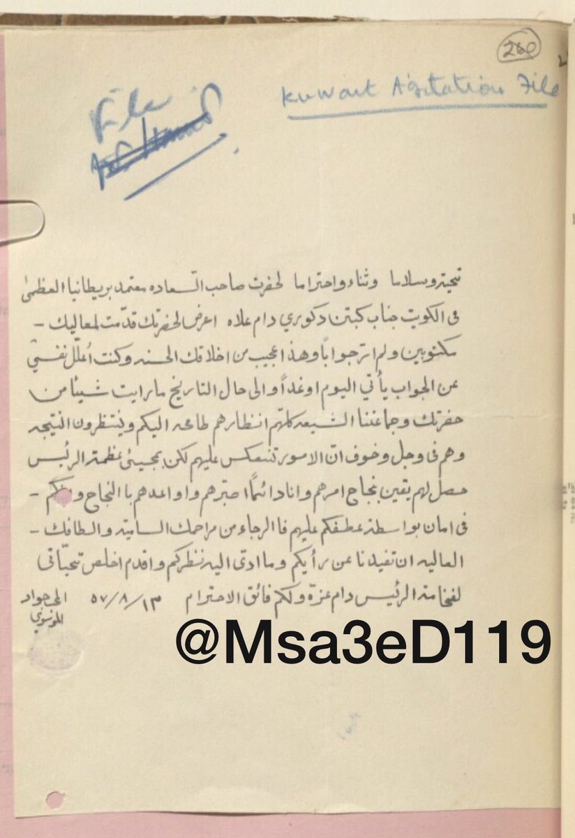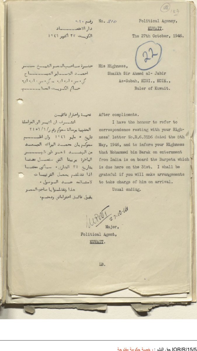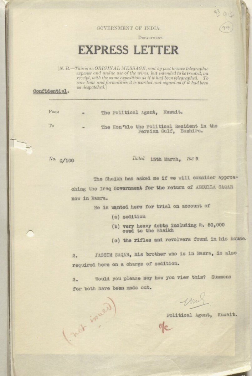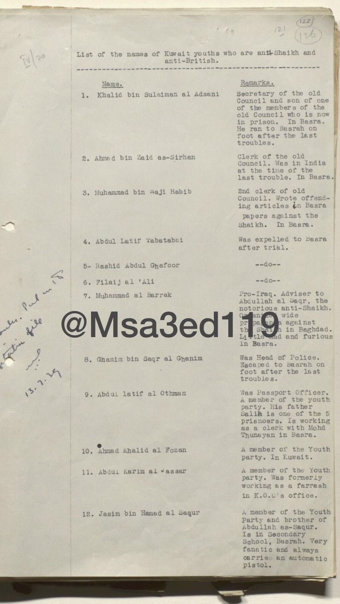 رسالة من المعتمد البريطاني عن اسماء الشباب الكويتيين الذين هم ضد الشيخ احمد الجابر والانجليز