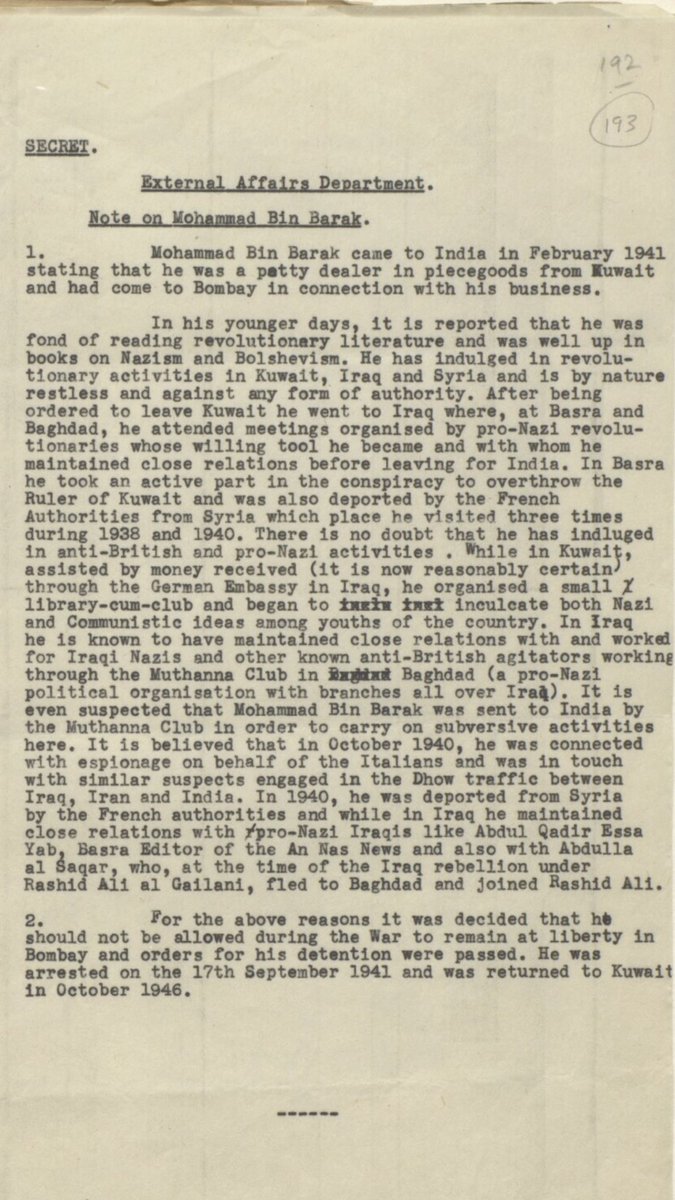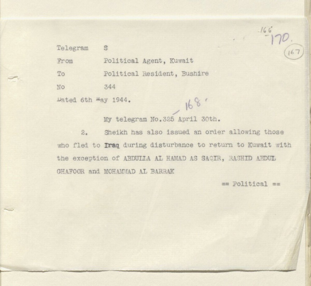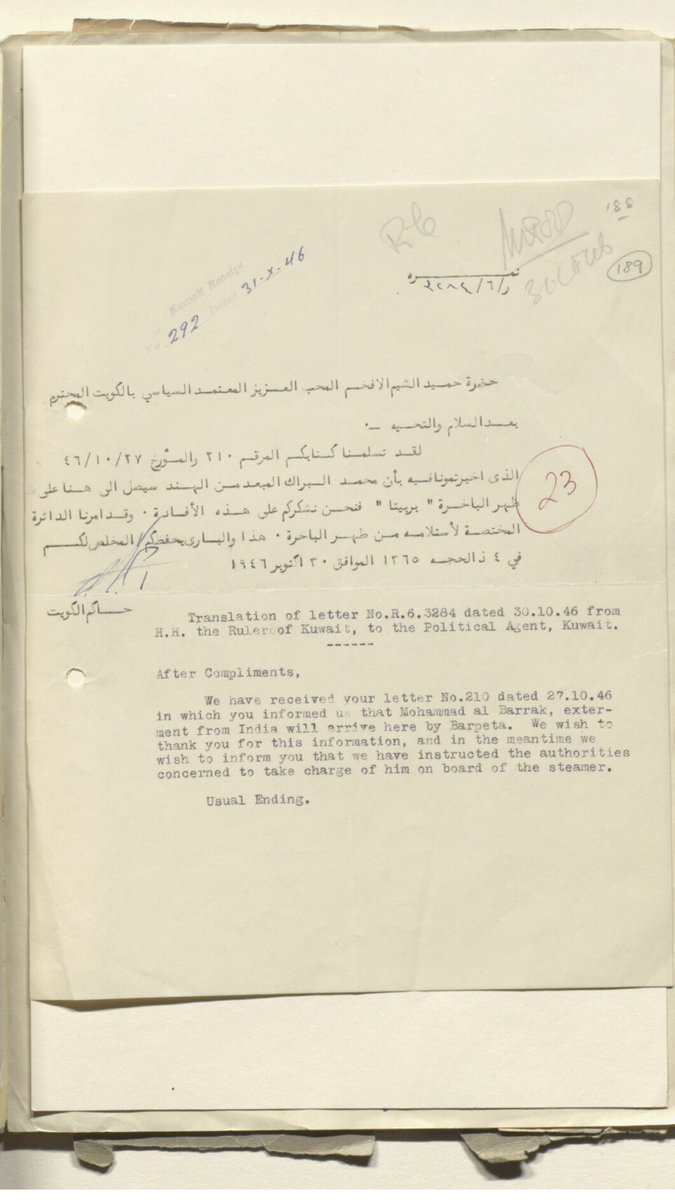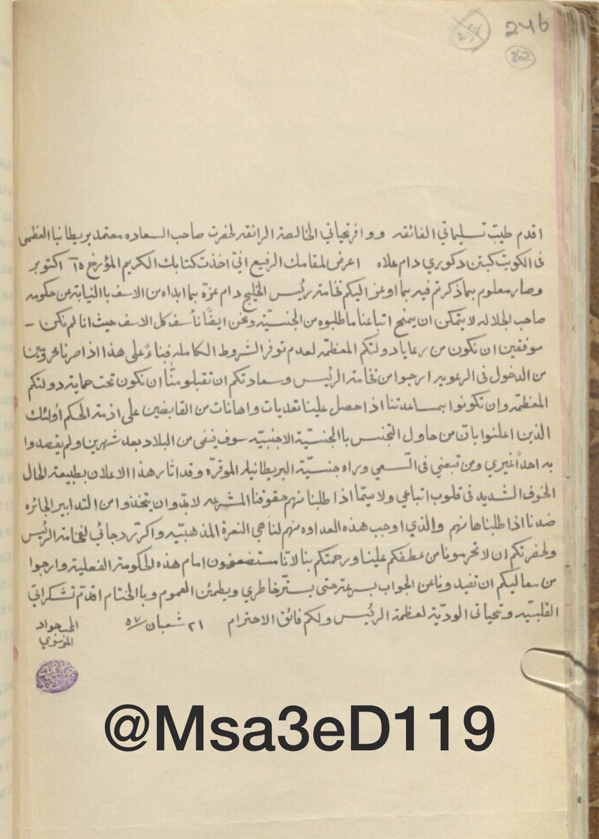 رسالة من المعتمد البريطاني عن اسماء الشباب الكويتيين الذين هم ضد الشيخ احمد الجابر والانجليز