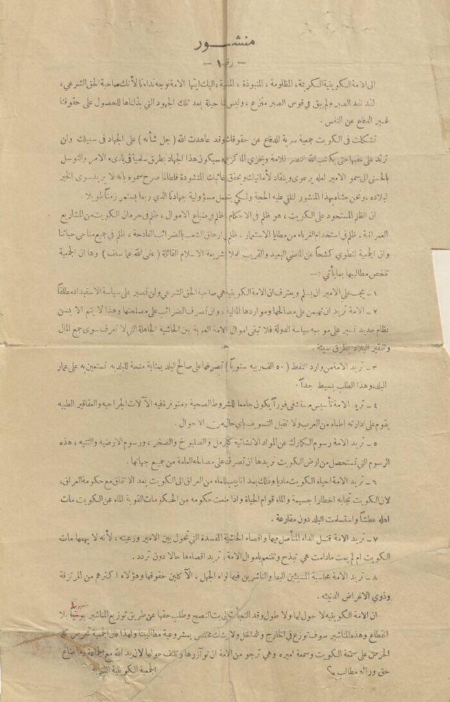 منشور من الجمعية الكويتية السرية التي تطالب بحقوق الامة والدفاع عن المكتسبات الشرعية بالمشاركة بالحكم ابان احداث 1938