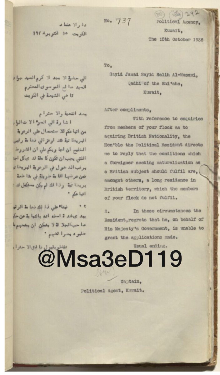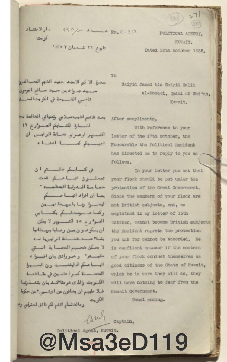 مراسلات بين زعيم الطائفة الشيعية السيد جواد الموسوي وبين المعتمد البريطاني في الكويت ديكوري: