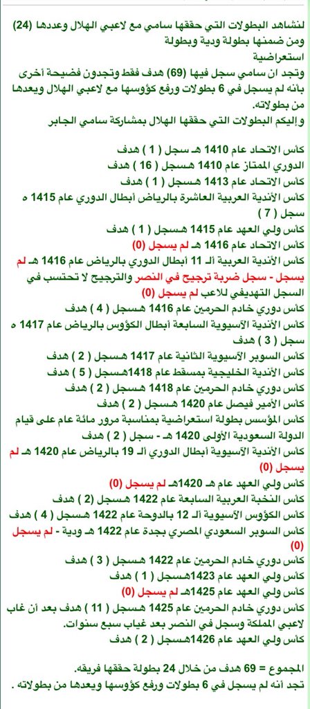 🔟 سوف يأتي من يرد علي ويقول #سامي_الجابر سجل في كذا وكذا !! لكن هل تسجيلة مقنع بعدد مشاركاتة وبوجود نخبة من افضل اللاعبين المحليين والاجانب الذين يحضرهم الهلال وهل مقنع ان الهلال يحقق الدوري وبطولات عربية واسيوية بدون تأثير منه وهو مشارك معهم ؟ وفي النهاية الهلال صنع سامي